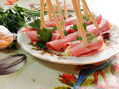Колбаса в диаметре была небольшая, поэтому для того, чтобы рулетки нормально держались, я воткнула в каждый из них шпажку для канапе.