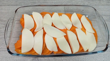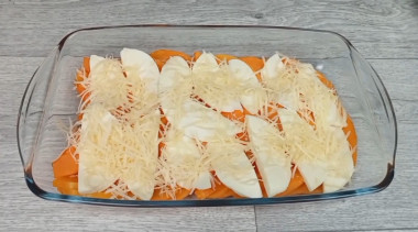 Завершите запеканку слоем тыквы. Верх равномерно присыпьте тертым пармезаном.