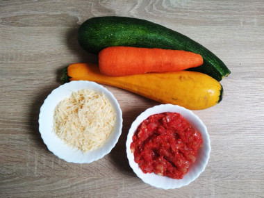 Пока начинка остывает, подготовьте ингредиенты для оформления верха. Кабачки и цукини должны быть молодыми, с нежной кожурой и семечками. Промойте овощи под проточной водой. Морковь очистите. Молодые кабачки и цукини можно не чистить, так как кожица у них тонкая и нежная, достаточно срезать только хвостики.