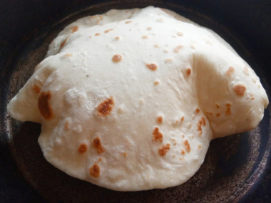 И снова переверните ее. На ваших глазах лепешка начнет надуваться. Дождитесь, пока ее рост не прекратится, и снова переверните на другую сторону. Важно переворачивать питу по два раза с каждой стороны, чтобы она хорошо пропеклась. Через полминуты пита готова, можно ее снимать со сковороды.