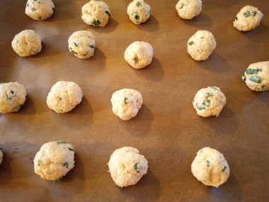 Противень застелите бумагой для выпечки и чуть влажными руками скатайте небольшие шарики 3 на 3 см приблизительно. Выложите их на противень на небольшом расстоянии друг от друга. Поставьте противень с шариками в духовку и выпекайте 5 - 7 минут при температуре 200 градусов, затем температуру снизьте до 180 градусов и пеките до золотистого цвета (10 - 15 минут). Из данного количества теста у меня получилось 17 шариков.