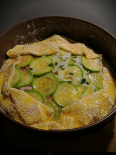 Правда помимо кабачков добавила помидоры между двух слоев из кабачков, ну и обильно посыпала края теста кунжутом, т.к. без ума от вкуса и хруста кунжута