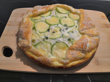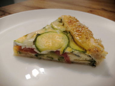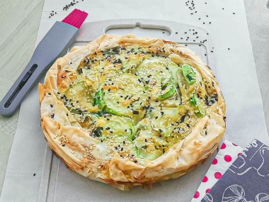 В моей морозилке лежала упаковка теста фило, поэтому решилась на эксперимент и использовала его вместо слоеного. В форму уложила два листа один на другой. К кабачкам добавила еще мелко нарезанный сладкий перец. Пирог сверху посыпала белым кунжутом, а пищевой мак заменила черным кунжутом. Волновалась, как получится с тестом фило, ведь оно очень тоненькое, но пирог получился на ура! Хрустящее тесто, сочная и ароматная овощная начинка - супер сочетание.