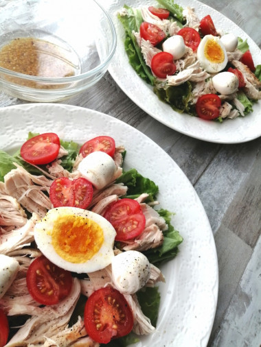 Калорийность продуктов: Куриное филе, Листья салата, Помидоры черри, Мягкий сыр, Яйца, Оливковое масло, Горчица зернистая, Лимонный сок, Соль