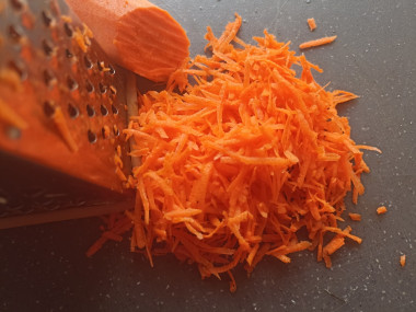 Выложите в кастрюлю с капустой немного натертой на крупной терке моркови.