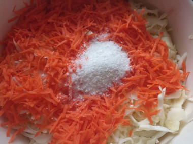 Теперь добавьте в кастрюлю с капустой немного поваренной соли крупного помола для засолки (не йодированную и не "Экстра").