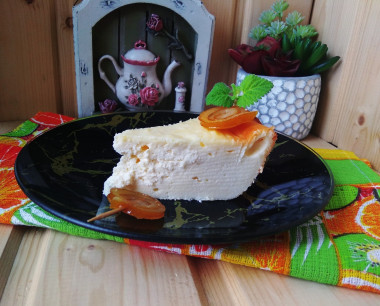 Я раньше творожную запеканку только так и делала, без манки и побольше яиц. Благодаря взбитым белкам тесто получилось воздушным, буквально как белое облачко. Муки высшего сорта у меня не было, поэтому заменила кукурузным крахмалом. Еще в творожную массу добавила пару ложек апельсинового сиропа. Варила цукаты и у меня осталось немного сиропа. Запеканка выпекалась у меня 40 минут, она довольно быстро схватилась, хоть и осталась светлой сверху. И еще когда я смазывала форму сливочным маслом, то взяла его слишком много, остатки выложила сверху на запеканку. Масло не впиталось почему-то после выпечки и я его еще горячим распределила по поверхности силиконовой кисточкой. Получилась аппетитная корочка. Запеканка даже в теплом виде хорошо режется, а уж в охлажденном и подавно) Вкус очень творожный, мне такой нравится. Тут всего в меру, очень вкусно! Запеканка просто прелесть, воздушная, сытная, отличный вариант для белкового завтрака!