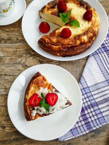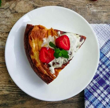 Так как творог был суховатый, добавила пару ложек сметаны, а еще лимонную цедру и щепотку ванилина для аромата. Творожную массу хорошо взбила блендером до однородности. Как автор и предупреждал запеканка заметно поднялась при выпекании, а при остывании осела, но не критично. Выпечка в моем исполнении сильно уж подрумянилась. Моя ошибка, так как не учла особенности своей духовки. Стесняюсь Вместо 50 минут в следующий раз таймер поставлю на 35-40 минут. Радует, что вкус не пострадал. Запеканка получилась очень нежной, воздушной. Подавала с клубникой в сливках. Очень вкусно! Красота!