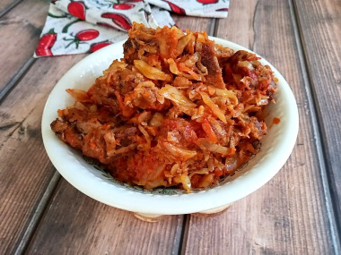 Сделайте огонь небольшим и, закрыв сковороду крышкой, продолжите тушить капусту с мясом 30 минут.