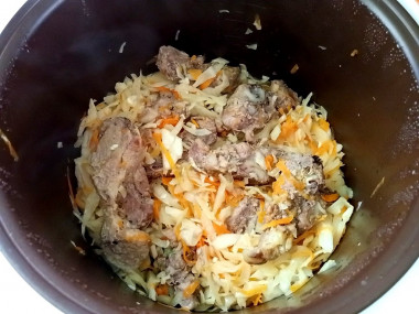 Сковороду снова закройте крышкой и продолжите тушить капусту около семи минут до полной готовности бигуса.