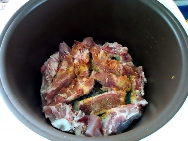 Мне было не удобно готовить в сковороде, поэтому доверила это дело мультиварке. Сначала обжарила свиные ребрышки до румяного цвета (20 минут). Затем добавила специи: смесь перцев, немного куркумы и молотый кориандр. Сверху выложила квашеную капусту. Она была не кислая, поэтому не промывала. Тушила 40 минут, периодически перемешивала. Потом добавила томат и чеснок и тушила ещё 10 минут. Процесс не сложный, все понятно.