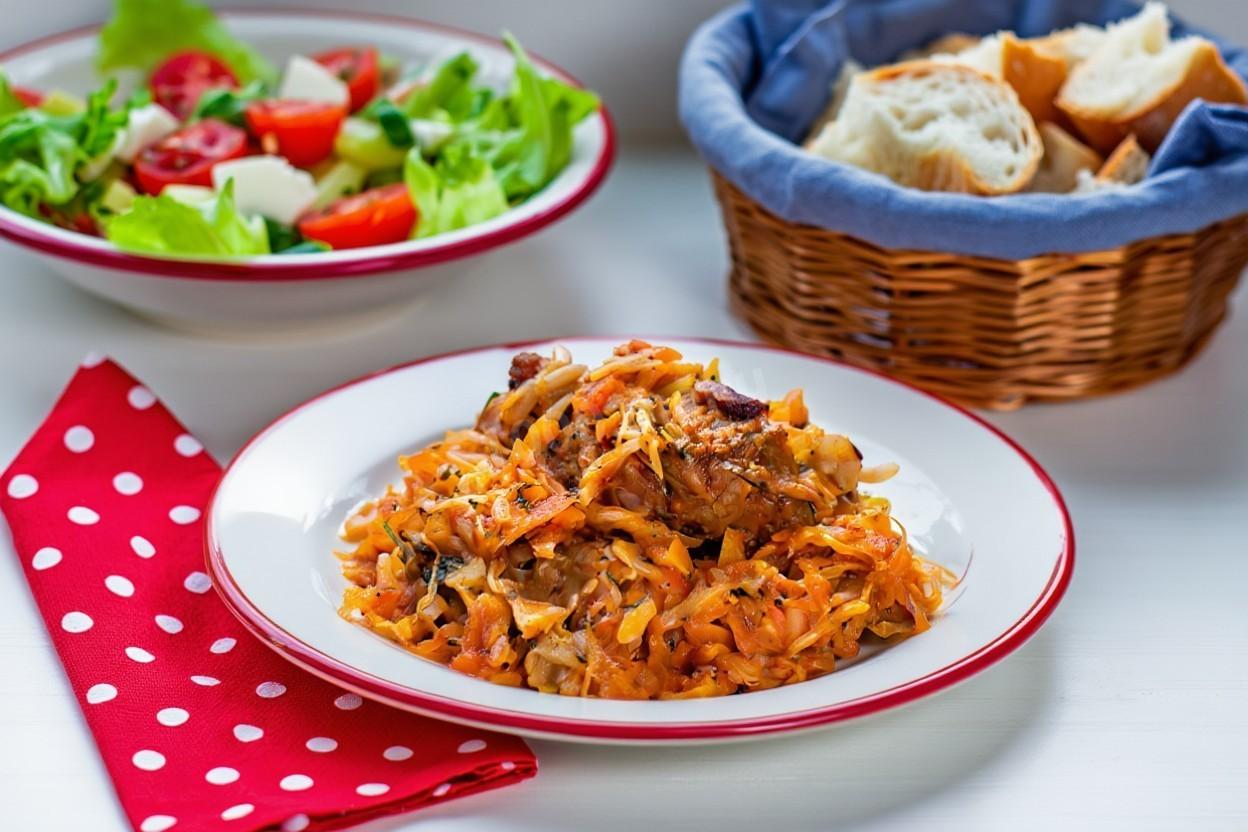 Разложите приготовленный бигус из квашеной капусты со свининой на ребрышках по порционным тарелкам и подайте к столу.
