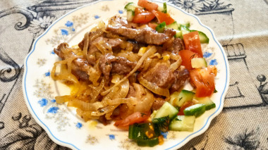 Насколько простое, настолько вкусное блюдо получилось по этому рецепту. Я взяла свиную шею. Мариновала час в специях с небольшим количеством масла. Лук взяла крупный и порезала полукольцами. На мой взгляд, в этом рецепте такая нарезка лука будет наиболее привлекательная и вкусная. Мясо получилось необыкновенно мягкое, сочное и нежное. К нему подойдёт любой гарнир в сочетании с овощами вообще беспроигрышный вариант.