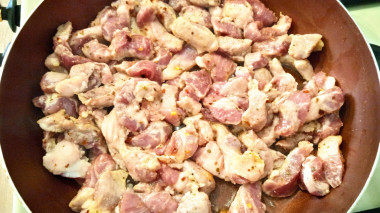 Для жарки разогрейте сковороду с растительным маслом. Учтите, что если мясо слишком жирное, то масла потребуется намного меньше, чем указано в рецепте. Иногда, если мясо жирное, можно обойтись и вовсе без масла. Включите средний или выше среднего огонь. Так как мясо жарится дольше лука, выложите на сковороду сначала только куски свинины в один слой. Если все сразу не помещается, жарьте в несколько заходов. Крышкой закрывать не нужно.