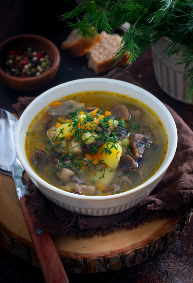 При подаче каждому предложите к супу мелко нарезанную свежую зелень, душистый перец. Очень вкусен суп из красной чечевицы и лесных грибов со сметаной.