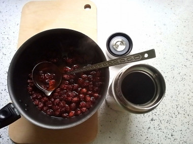 Затем снимите сотейник с огня, накройте его крышкой. Для удобства можете перелить отвар с ягодами в стеклянную банку.