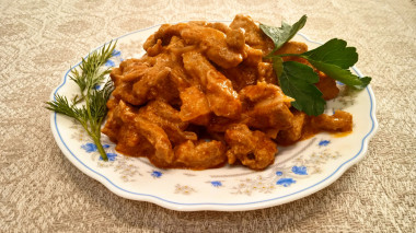 Мясо получилось нежнейшее! Я брала свиную шею, около часа промариновала его в сухих специях с чесноком. Лук у нас остался маринованный, от приготовления шашлыка. Порезала его небольшими кусочками и добавила к мясу. В итоге он практически полностью растворился. Очень вкусная подлива, томатный соус со сметаной с добавлением бульона. Большое спасибо автору за простой и вкусный рецепт Поджарка из свинины с подливкой на сковороде! Готовьте с удовольствием.