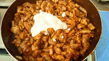 В конце добавьте сметану, соль и молотый перец. Все перемешайте и потушите еще 2 минуты. Затем уберите сковороду с огня.