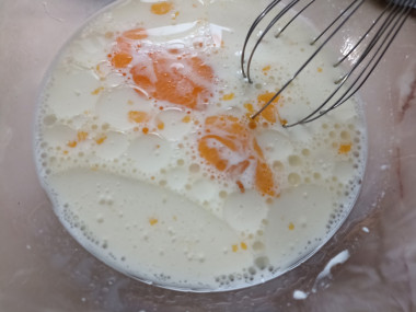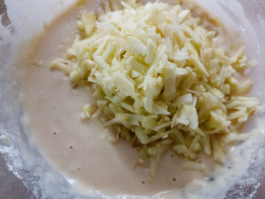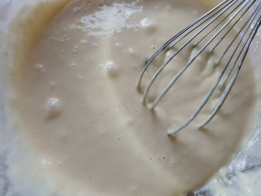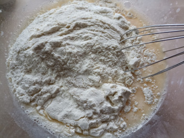 Всыпьте просеянную с разрыхлителем муку. Важно просеять муку, чтобы насытить ее кислородом. Тогда выпечка получится воздушной и хорошо поднимется при выпекании. Тщательно перемешайте тесто, разбивая все комочки. Тесто должно получиться, как на оладьи. Если тесто очень густое, добавьте еще молока. Если наоборот чересчур жидкое, всыпьте еще немного муки. Смотрите на консистенцию.