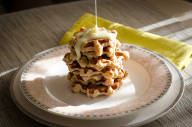 Готовые венские яблочные вафли выложите на тарелку и подайте к столу, посыпав сахарной пудрой. Такие вафли можно также испечь в мультипекаре. Приятного аппетита!
