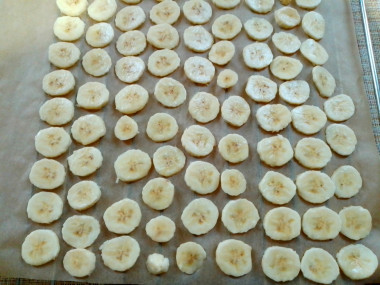 Противень смажьте небольшим количеством растительного масла или застелите пергаментом. Каждый кусочек обмакните в лимонный сок для того, чтобы бананы не потемнели при сушке. Выложите кусочки бананов в один слой, оставляя между ними небольшое расстояние.