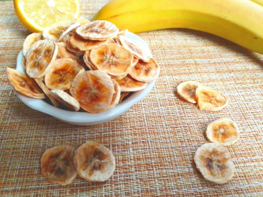Сушите бананы около двух часов. Смотрите по их состоянию — они постепенно начнут отдавать влагу и подсыхать. Вы можете ускорить процесс сушки, если увеличите температуру до 80°-90°С. Но тогда чипсы выйдут очень темными. Вместо противня можете взять подходящую решетку — так бананы также подсохнут быстрее.