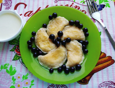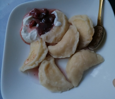 Тесто замесилось отлично, раскатывалось тонко. Вареники лепить одно удовольствие, главное воду сразу поставить кипятить, потому что вареники мы слепили быстро) Получились очень вкусные сладенькие творожные вареники, со сметаной вообще вкуснотища, мы еще черную смородину в тарелки разложили. И получился у нас замечательный завтрак и совместное с ребенком творчество на кухне.