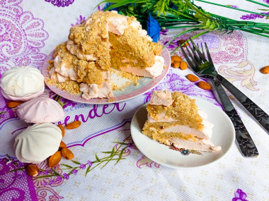 Торт я сделала из расчёта на 200 граммов зефира. По расчетам калькулятора получилось на 4 порции. Зефир использовала со вкусом крем-брюле. Вместо арахиса взяла миндаль. Печенье у меня было обычное сахарное.