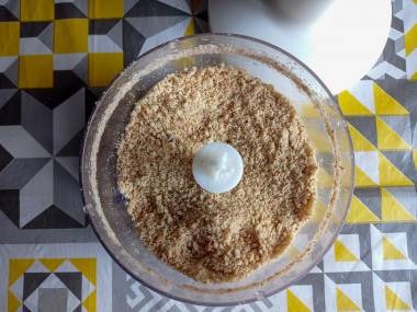 Печенье измельчите с помощью блендера или раскрошите руками. Печенье можете использовать любое: бисквитное сахарное или обычный несоленый крекер. Есть еще хороший способ измельчения печенья: нужно сложить его в пакет, конец пакета завязать и измельчить печенье скалкой.