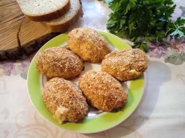 Решила сделать котлетки для ребенка и мне очень понравился этот рецепт. Куриный фарш я использовала покупной. Добавила измельчённый лук, размоченный батон, соль и молотый кориандр вместо перца. От себя ещё положила желток в фарш. Тщательно перемешала и отбила об стенки миски. Сформировала лепешки и положила кусочки сыра. Сыр взяла гауда, он вкусный и хорошо плавится. Обваляла котлетки в панировочных сухарях и запекала пол часа в духовке. При запекании из пары котлет слегка вытек сыр, видимо я плохо обваляла. Куриные котлеты с сыром в духовке - это просто и быстро. Потрясающе вкусные и сочные котлетки. Ребенок слопал с большим удовольствием котлетку с сыром. Получилась хрустящая корочка снаружи и сочная котлета внутри. Благодаря духовке, они абсолютно не жирные. Куриные котлетки мягкие и нежные. Это обалденно вкусно. Замечательный рецепт! Спасибо автору!