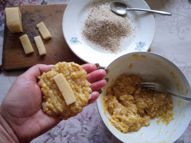 Из каждой части фарша влажными руками сделайте лепешку и положите в ее центр по брусочку сыра. Соедините края и сформируйте котлетки.
