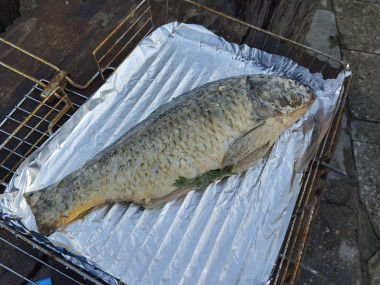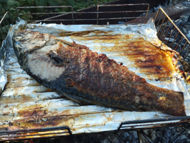 Выложила карпа на решетку с фольгой,накрылс вторым листом и запекала на углях в течение 20 минут.Этого времени вполне хватило,чтобы карп приготовился.