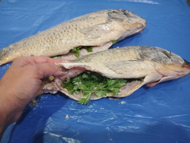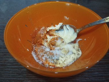 Майонез смешала с солью, специями,чесноком и смазала карпа снаружи и внутри. Оставила минут на 40 мариноваться.