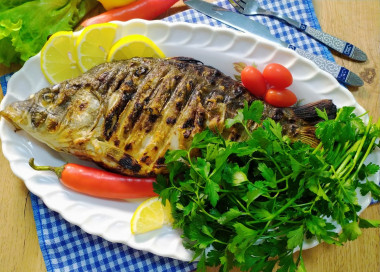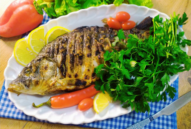 Карп, приготовленный на углях изумительно вкусен в горячем виде. Подать его можно с различными соусами, свежими овощами и салатами.