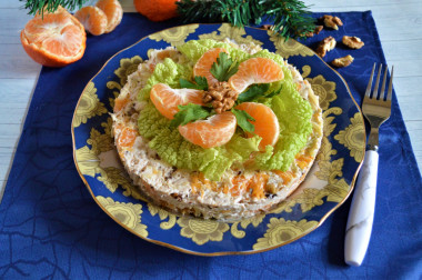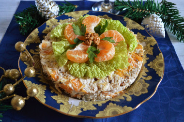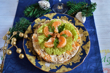 Подавайте салат, сформировав его в кулинарном кольце. На блюдо установите кулинарное кольцо, заполните его салатом и утрамбуйте. Поставьте салат на 1 час в холодильник для пропитки. Перед подачей кольцо снимите, украсьте его дольками мандаринов, веточками петрушки и грецкими орехами. Приятного аппетита!