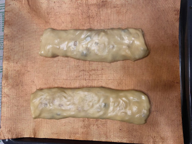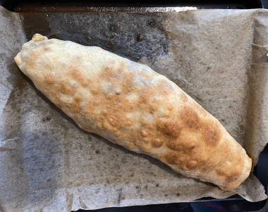 Противень застелите бумагой для выпечки. при помощи полотенца перенесите рулет на противень. Получается довольно длинный рулет, на мой противень размером 30*40 см он поместился только по диагонали. Вы можете тесто разделить на две части и сделать два небольших штруделя.