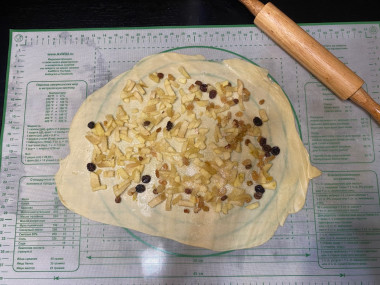 Спасибо за рецепт, очень хороший десерт. Тесто замешивала минут 15, после чего дала отдохнуть. Растягивалось просто, порвалось лишь единожды, но совсем не сильно и ближе к концу процесса, поэтому начинка нигде не вытекла. Вместо растительного масла использовала растопленный маргарин, особых изменений не заметила. Яблоки отлично сочетаются с изюмом и орехами! Помимо корицы я добавила щепотку молотого имбиря