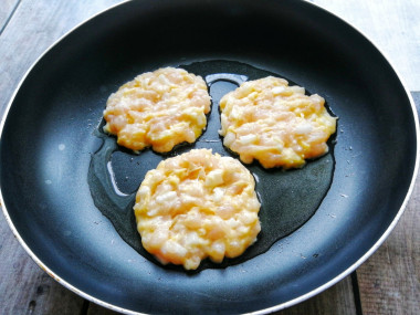 Далее смотрим, как пожарить рубленные куриные котлеты. Налейте на сковороду растительное масло и прокалите его. Выложите по небольшому количеству фарша и обжаривайте котлеты с двух сторон примерно по 5 минут на среднем огне. Готовые котлеты уберите со сковороды и жарьте следующую партию. Используйте весь фарш.