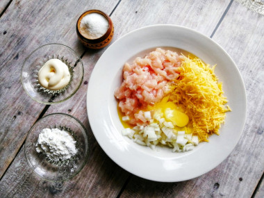 Как сделать куриные котлеты рубленные с сыром и майонезом Нежность? Подготовьте продукты по списку.