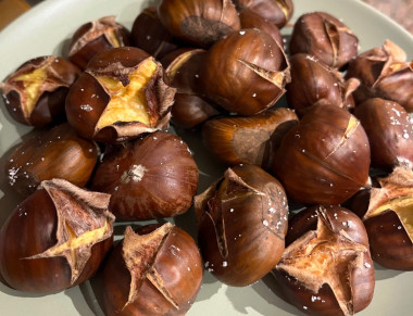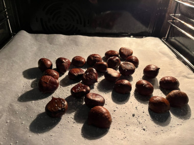 Каштаны будут готовы через 20-30 минут. Мякоть некоторых может выступать из-под скорлупы- это вполне нормально.