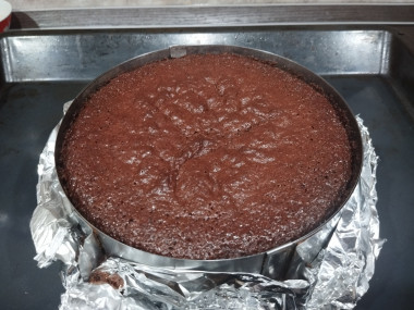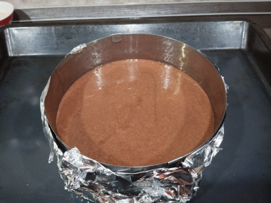 Форму для запекания диаметром 20 сантиметров смажьте растительным маслом и слегка обсыпьте мукой. Из бумаги для выпечки вырежьте круг и уложите его на дно формы. Подготовленную фольгу оберните вокруг формы и закрепите.
