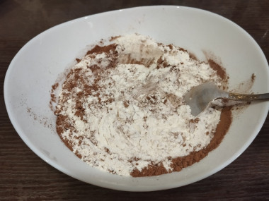 Добавьте в миску с мукой какао и перемешайте. Какао лучше всего взять чистый, высшего сорта. Смеси для приготовления горячего шоколада или готовое какао для напитка не подойдут. В нем уже есть сахар, и цвет получится блеклый и не аппетитный.