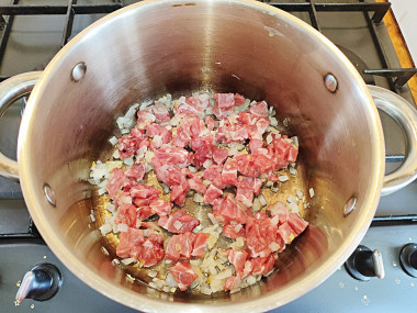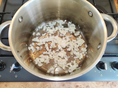 В большой кастрюле с толстым дном разогрейте растительное масло и обжарьте лук около 3 минут. О том, как подобрать идеальную кастрюлю для супа читайте в статье по ссылке в конце рецепта. Можете также готовить суп в казане.
