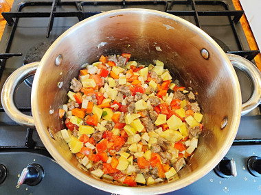 Выложите в кастрюлю картофель, всыпьте зиру, кориандр, черный перец. Жарьте все вместе, помешивая, 5 минут. О том, какие еще специи подойдут для блюд с мясом, читайте в статье по ссылке в конце рецепта.