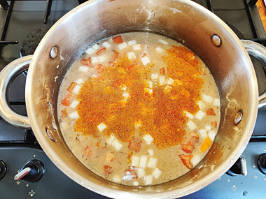 Влейте в кастрюлю примерно 2 л горячей воды. Информацию о том, как рассчитать количество воды для супа, вы найдете в конце рецепта под шагами. Суп посолите по вкусу. Доведите до кипения и варите на медленном огне под крышкой около 10 минут. Если у вас есть 1-2 мелких сушеных перца чили, можете добавить их для большей остроты.