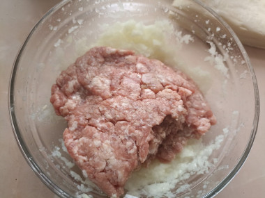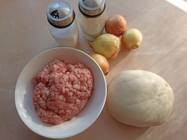Пока тесто отдыхает, приготовьте начинку. Подготовьте продукты для нее. Фарш можно брать из любого мяса, у меня говядина. Лука традиционно кладут очень много, он придает сочность начинке. Кроме молотого перца можете положить любые любимые приправы и специи.