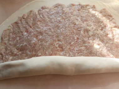 Выложите на тесто фарш, размазывая его ложкой в тонкий слой. Края оставьте свободными.