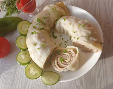 Для сытного перекуса приготовила ленивый большой пельмень ханум. Замесила тесто, пока оно "отлеживалось" в холодильнике, занялась начинкой: фарш у меня уже был ( свиной) , лук измельчила с помощью блендера, добавила по вкусу соль и черный перец, тщательно перемешала. Тесто тонко раскатала ( гладкое, эластичное тесто хорошо раскатывается в тонкий пласт), равномерно выложила начинку, сформировала рулет. Варила его в мультиварке в режиме " варка на пару". Ханум получается сочный, сытный! К нему подала томатный и сметанный соус, свежие овощи. После такого перекуса все сыты и довольны))) Спасибо за рецепт, katushafin!