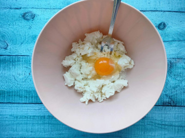 Добавьте к творогу одно яйцо и сахар. Если вам нравятся сырники послаще, то количество сахара можно увеличить по вкусу. Перемешайте всё до однородной массы.