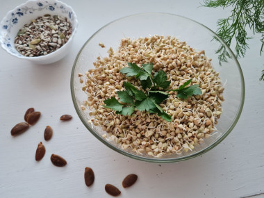 Через 24 часа, а иногда и немного раньше, на гречке появятся небольшие белые росточки - это значит, что вы все сделали правильно. Если этого не произошло, то попробуйте сбрызнуть крупу водой и оставить еще на некоторое время.